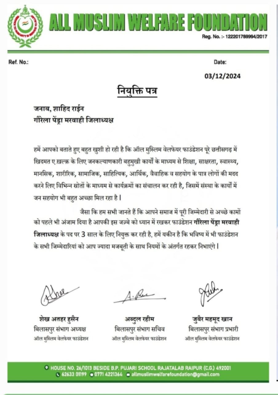 ऑल मुस्लिम वेलफेयर फाउंडेशन छत्तीसगढ़ की तरफ से शाहिद राईन को जिला गौरेला पेंड्रा मरवाही का जिलाध्यक्ष नियुक्त किया गया है।