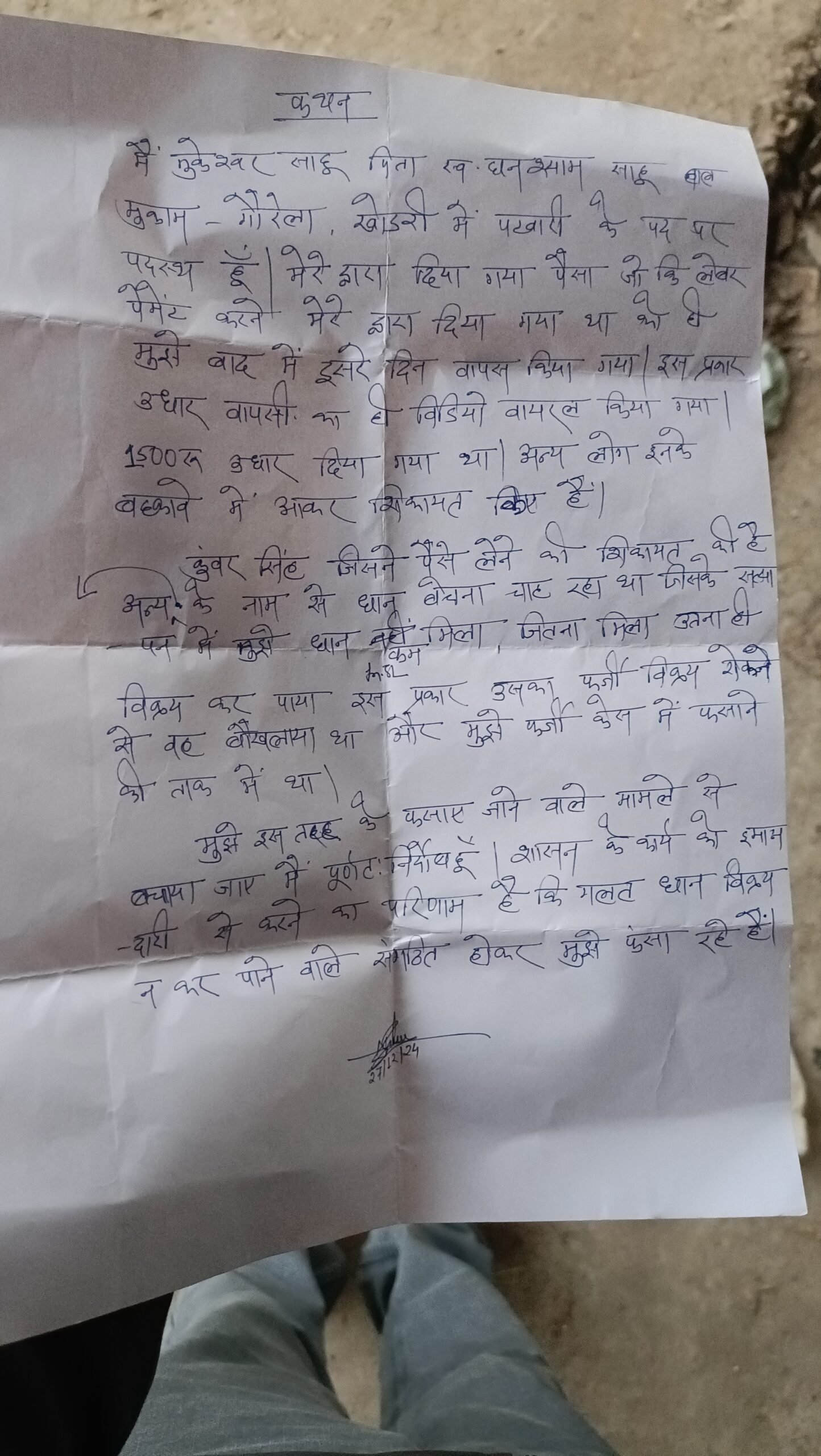 पट्टा अपने अंडर में रख कर खोडरी धान मंडी में धान बेचने का काम चालू रहता है यह कहानी तब शुरू होती है जब पटवारी मुकेश्वार साहू की धान मंडी में ड्यूटी लगती है वहां कुंवर सिंह राठौड़ के द्वारा अन्यत्र किसानों के पट्टे पे धान बेचने का कार्य करता था लेकिन पटवारी मेकेश्वर साहू की कार्य शैली इतनी कसावट भरी थी की उनके हल्के में जितने भी किसानों का टोकन कटता उनके घर में जाकर सत्यापन करना और शासन के निर्देश नुसार कार्य करना था जब कुंवर सिंह राठौर ग्राम ठेंगा डांड निवासी का अपना दाल गलना बंद होते समझ आया तब वह धीरे से पटवारी मुक्तेश्वर साहू से दोस्ती करना चालू किया और इसी बहाने एक दिन खोडरी धान मंडी के बाहर जब पटवारी मुक्तेश्वर साहू अपनी ड्यूटी के दौरान जब वह सड़क पर आए उसी समय कुंवर सिंह राठौर ग्राम ठेंगा डांस पटवारी से निवेदन कर 1500 से 2000 रूपये उधारी लेबरों को पैमेंट करने के लिए मांग लिया जिसे बाद में वापस करने की बात कही गई. तो वह अगले दिन अपना पैसा लेने उनके घर के किराने दुकान में गए और उनसे पैसा वापस करने की बात कही तभी कुंवर सिंग ने उनका पैसा वापस किया अब उन्हें क्या मालूम कि वह पैसा वापस लेते समय एक गुप्त कैमरे में खड़ा करके वह पैसा वापस देगा