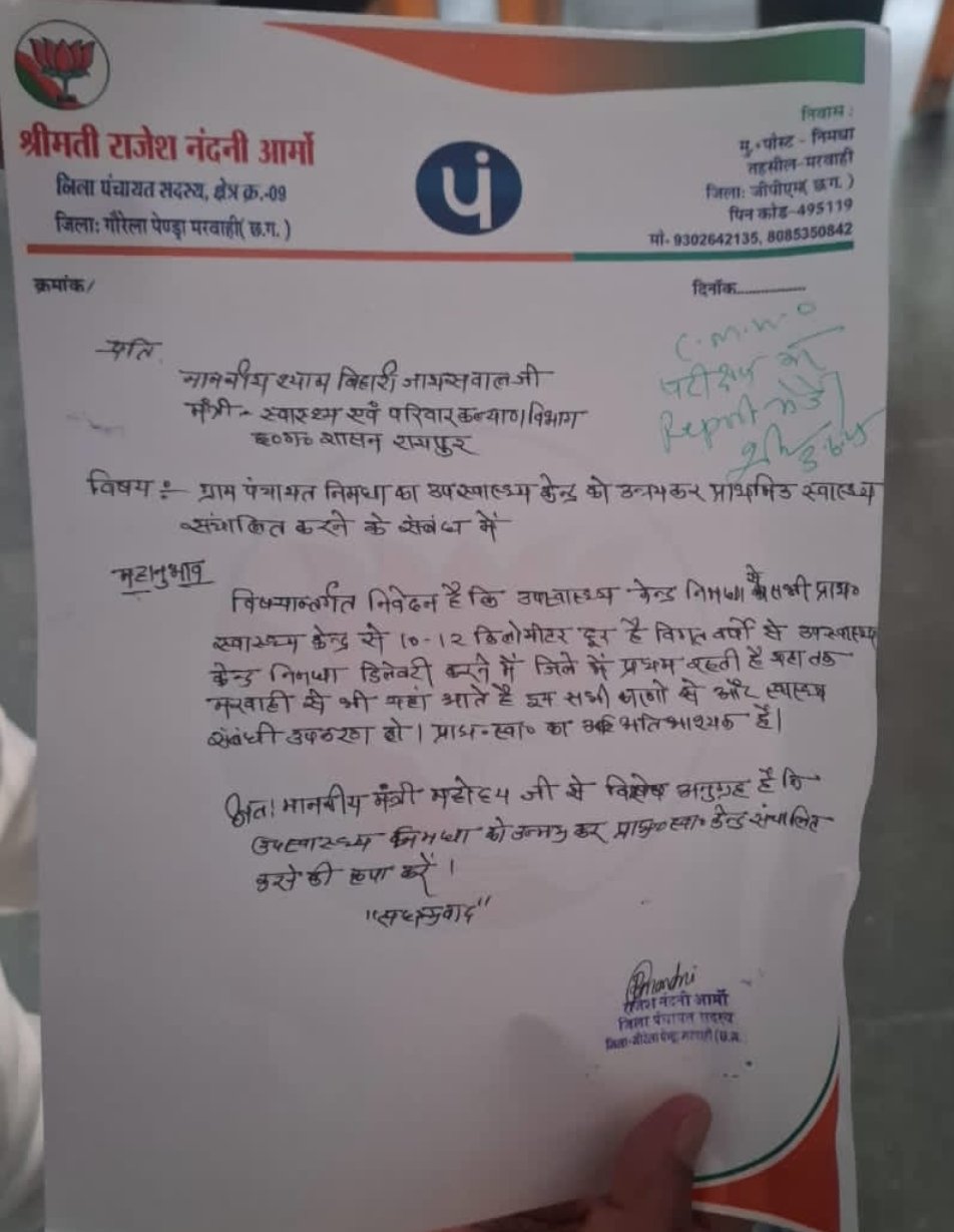 जिला सदस्य राजेश नंदनी आर्मो के द्वारा स्वस्थ मंत्री से निमधा स्वस्थ केंद्र के उन्नयन की मांग की गयी