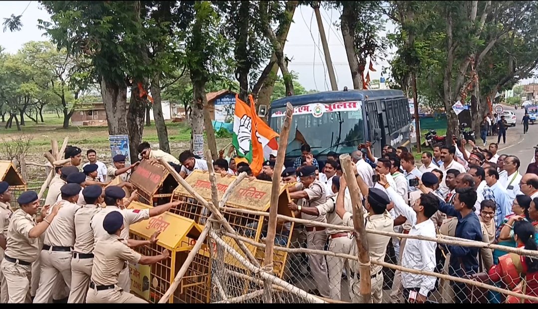 स्थानीय समस्याओं और जनहित के मुद्दों को लेकर जिला कांग्रेस कमेटी ने आज जोरदार प्रदर्शन करते हुए कलेक्टर कार्यालय का घेराव किया। इस दौरान कांग्रेस कार्यकर्ताओं की बड़ी संख्या मौजूद रही। प्रदर्शन को देखते हुए जिला प्रशासन ने सुरक्षा के पुख्ता इंतजाम किए थे, लेकिन आक्रोशित कार्यकर्ताओं ने पुलिस के बैरिकेड तोड़ते हुए हर्डल पर चढ़ गए हालांकि, पुलिस बल ने उन्हें आगे बढ़ने से रोक दिया। बाद में कांग्रेस प्रतिनिधिमंडल ने राज्यपाल के नाम ज्ञापन सौंपा।