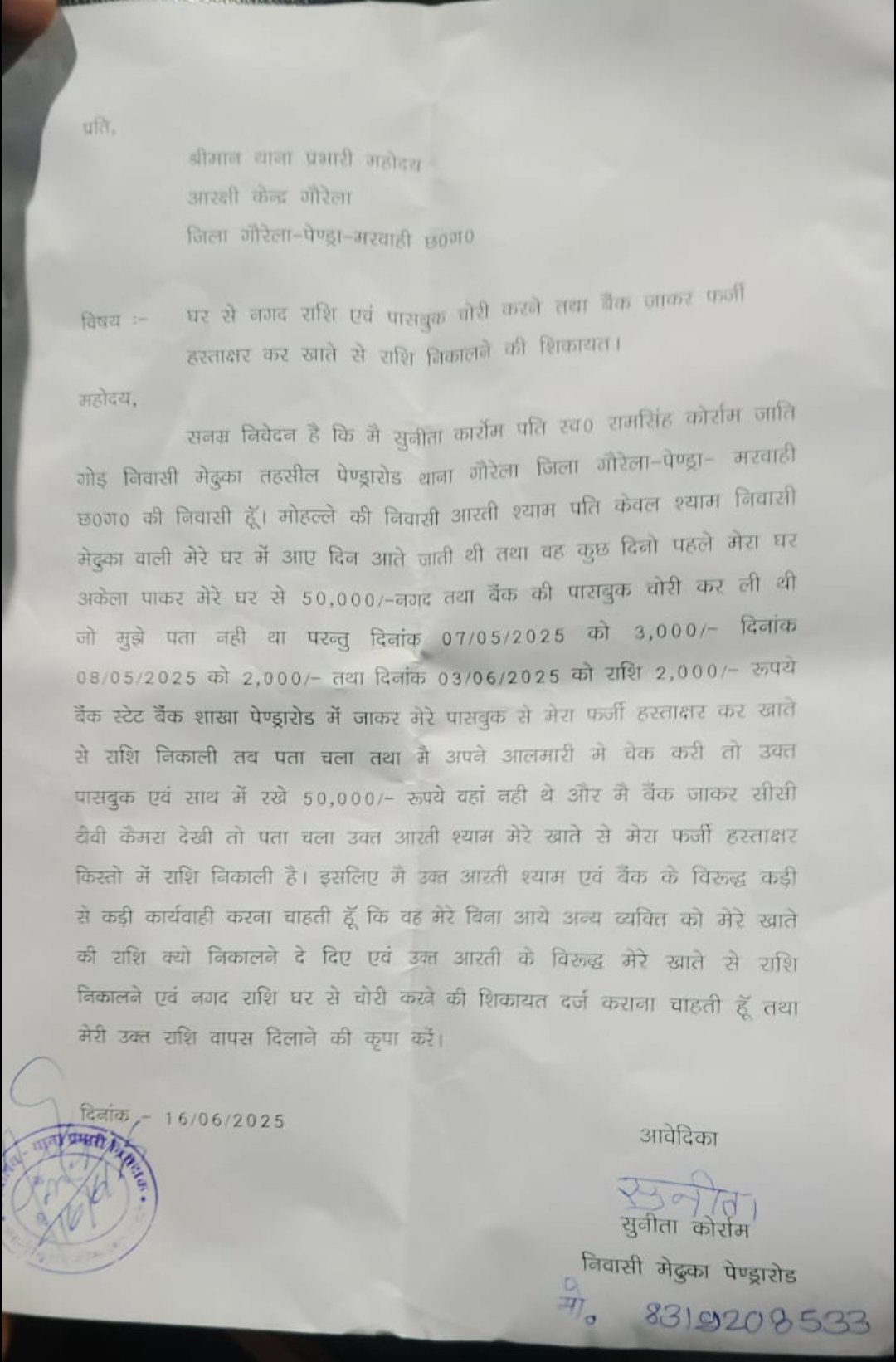 ग्राम पंचायत मेदुका से बड़ा ही चौकाने वाला सनसनी खेज मामला सामने आया है ग्राम पंचायत मेदुका से जहाँ की एक महिला आरती श्याम के ऊपर ग्राम की महिलाओ ने आरोप लगाया है की आरती श्याम जो की सक्रिय महिला है उसके द्वारा त्रिदेव महिला समूह के खाते से ₹600000 फर्जी दसखत और प्रस्ताव बना कर निकाल लिए गए. इसी प्रकार अन्य समूह के खाते से तीन-तीन लाख रुपए, एवं गौरी महिला समूह से cif का 60,000 रु बिना किसी की सहमति और जानकारी के निकाल लिया गया आरती श्याम के द्वारा. वही मामला तब संज्ञान मे आया ज़ब पास की महिला सुनीता कोराम ने बताया की उसके घर मे अलमारी से आरती श्याम ने 50 हजार रु नगद और पास बुक चोरी कर बैंक मे फ़र्ज़ी दस्तखत कर तीन किस्त में राशि उनके खाते से निकाल ली. जिसकी जानकारी मिलते ही सुनीता कोराम के द्वारा गौरेला थाने एवं स्टेट बैंक गौरेला में शिकायत की गयी.