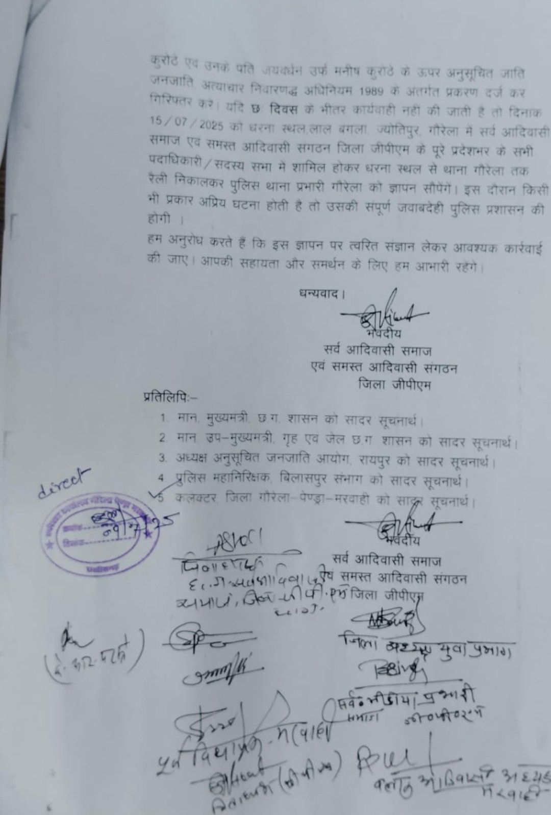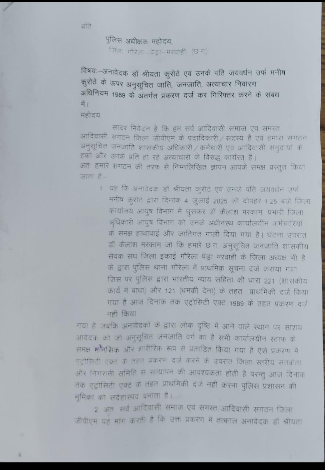 जिला गौरेला पेंड्रा मरवाही में बीते दिनों आदिवासी समाज के डॉक्टर के साथ उनके चेंबर में घुसकर कुछ लोगों के द्वारा दबंगई दिखाते हुए बदसलूकी किया गया था जिसकी शिकायत जिला प्रशासन से की गई थी परंतु आज दिनांक तक कोई कार्यवाही ना होता देख सर्व आदिवासी समाज ने श्रीयता कुरोठे और पति जयवर्धन उर्फ मनीष कुरोठे के ऊपर एट्रोसिटी एक्ट में मामला दर्ज करने की मांग की है उचित कार्यवाही नहीं होने पर उग्र आंदोलन की चेतावनी दी गयी है. 15 जुलाई 2025 को इस विषय को लेकर आदिवासी समाज एक साथ मिलकर उग्र आंदोलन करने जा रहा है समाज के जनप्रतिनिधियों ने बताया कि यदि अधिकारियों के साथ इस प्रकार का कार्य हो रहा है तो आम जनता के साथ क्या कुछ नहीं होता होगा हमारे क्षेत्र के भोले भाले आदिवासी हमेशा से दबाए जाते हैं कुचले जाते है