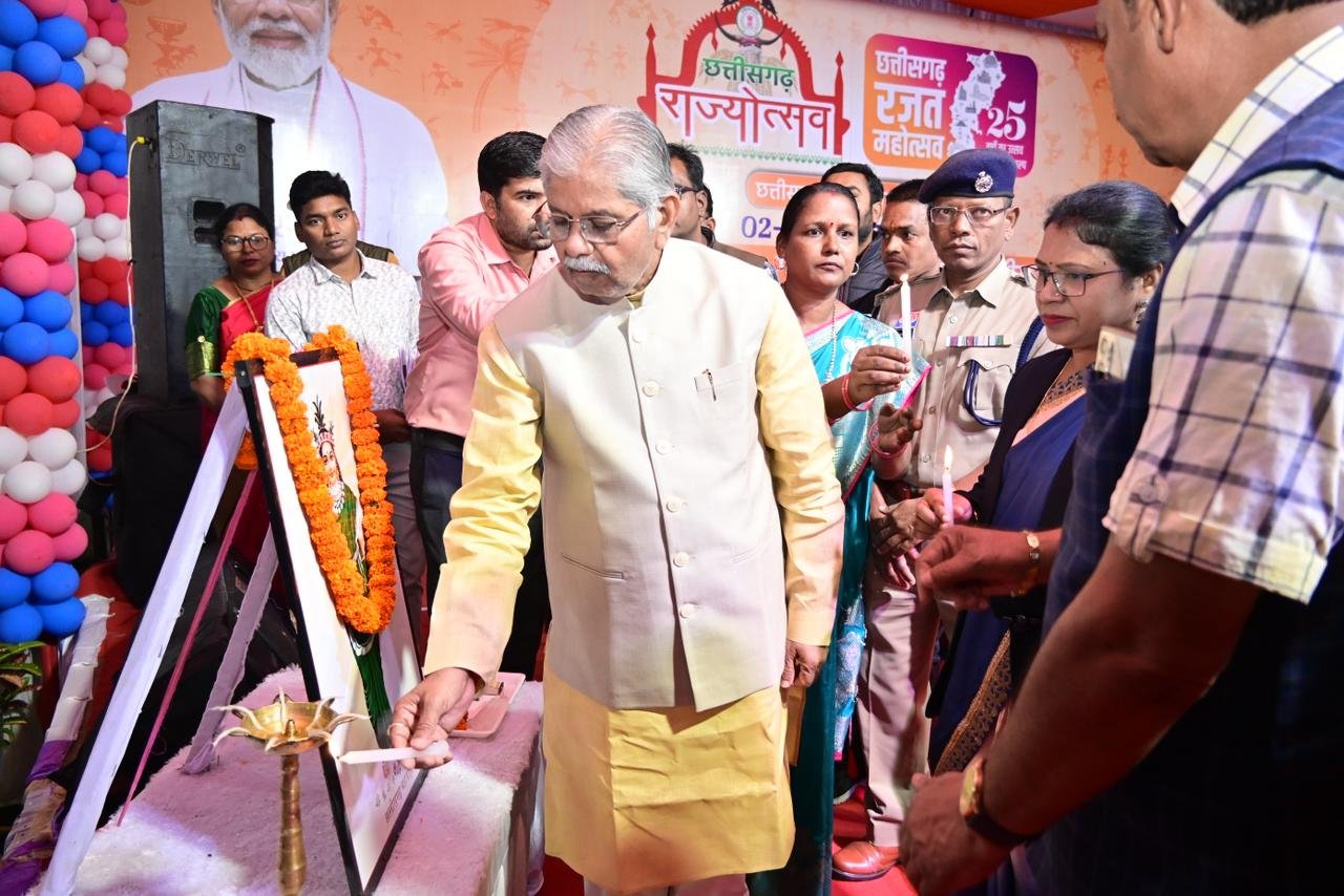 कौशिक ने कहा कि प्रधानमंत्री नरेंद्र मोदी के विकसित भारत के संकल्प के साथ बढ़ते हुए हमें भी विकसित छत्तीसगढ़ बनाना है। हम सब के लिए यह गर्व की बात है कि मुख्यमंत्री विष्णुदेव साय के नेतृत्व में छत्तीसगढ़ ने इस यात्रा के लिए अंजोर विजन डाक्यूमेंट 2047 बनाया है। कौशिक ने छत्तीसगढ़ राज्य के निर्माता तत्कालीन प्रधानमंत्री स्वर्गीय अटलबिहारी बाजपेयी जी को नमन करते हुए कहा कि बाजपेयी ने प्रदेशवासियों के सपने को साकार किया है। उन्होंने छत्तीसगढ़ में बीते 25 वर्षों में हुए महत्वपूर्ण बदलाव और विकास की जानकारी के साथ ही प्रधानमंत्री आवास की उपलब्धि, धान खरीदी, दो साल के धान खरीदी की बकाया राशि का भुगतान, महतारी वंदन, निर्वाध बिजली आपूर्ति, पलायन पर रोक, शिक्षा, स्वास्थ्य, सड़क के क्षेत्र में हुए विकास सहित अनेक विकास कार्यों की जानकारी दी। मुख्य अतिथि कौशिक द्वारा छत्तीसगढ़ महतारी की छायाचित्र के समक्ष दीप प्रज्जवलित करने के बाद राजगीत के साथ कार्यक्रम का शुभारंभ किया गया।