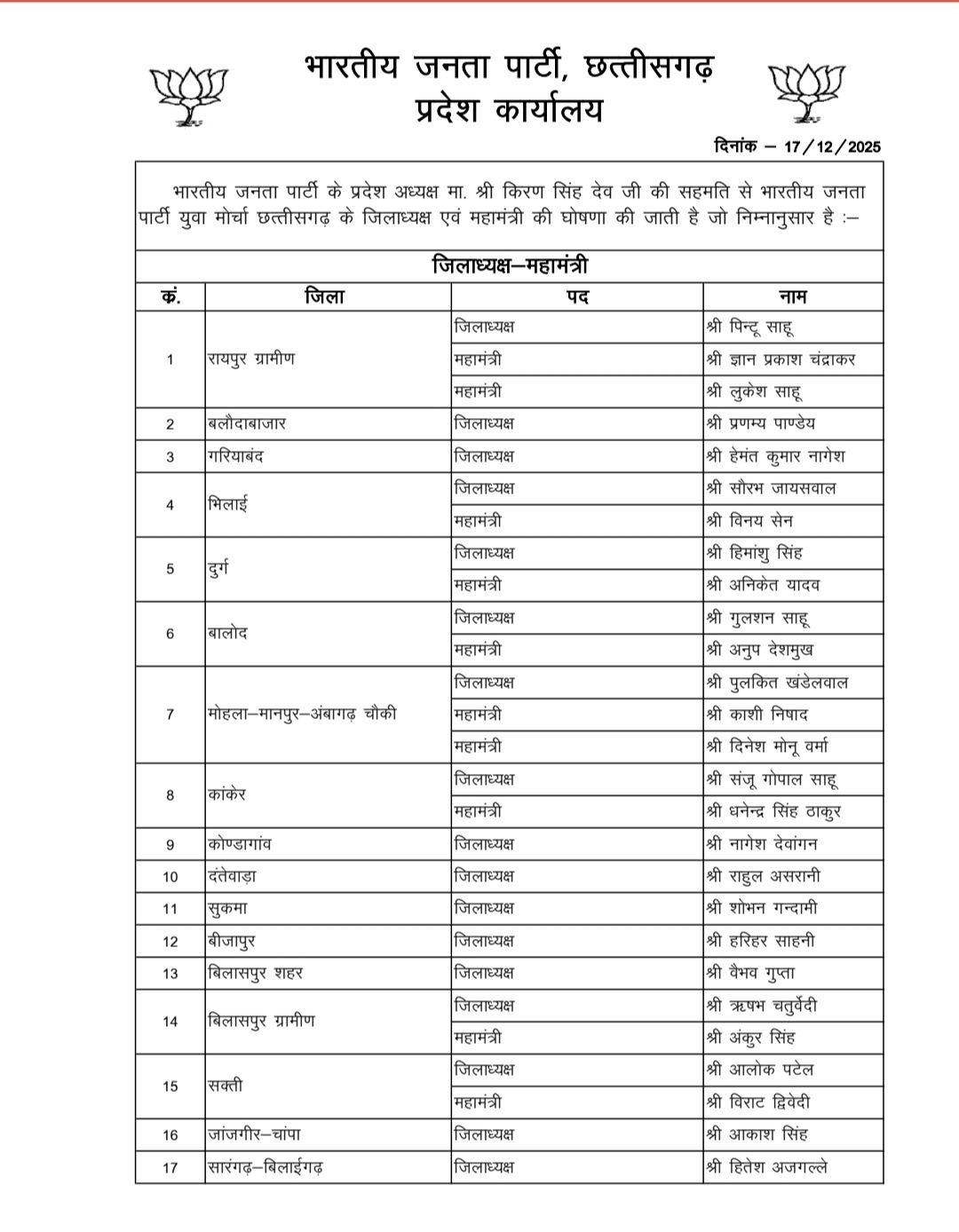हितेश अजगल्ले का नाम सूची में आते ही युवा मोर्चा के कार्यकर्ताओं में उत्साह और नई उम्मीद दिखाई दी। लंबे समय से संगठन में सक्रिय रहकर उन्होंने जिस निष्ठा, अनुशासन और समर्पण के साथ काम किया, उसी का परिणाम आज उन्हें इस महत्वपूर्ण जिम्मेदारी के रूप में मिला है। पार्टी नेतृत्व ने स्पष्ट संदेश दिया है कि जिन्होंने जमीनी स्तर पर लगातार मेहनत की है, वही युवा मोर्चा में नेतृत्व की जिम्मेदारी पाएंगे।